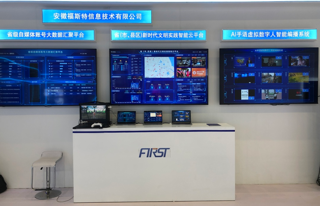 安徽福斯特信息技術有限公司此次應邀參展,以廣電媒體發展為亮點,集中展示大數據、人工智能呈現了AI-VLOG視頻智能合成系統+AI手語虛擬數字人智能編播系統+省級自媒體賬號大數據匯聚平臺+?。ㄊ小⒖h區)新時代文明實踐智能云平臺技術。